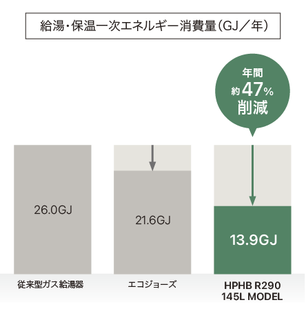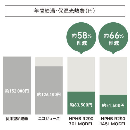 これにより、従来のガス給湯器やエコキュートと比較して月々の光熱費(ランニングコスト)を大幅に削減し、節約効果が期待できます。従来型給湯器と比較すれば、光熱費を約66%(約100,600円)※6削減可能に!