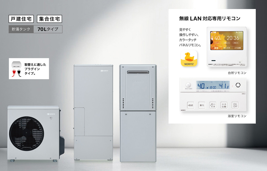 基礎工事が不要な70L MODELに、ヒートポンプユニットの専用電源工事が不要なプラグイン機をラインアップ。