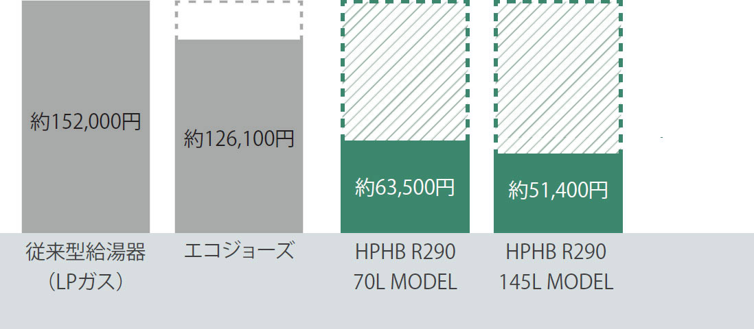 • ※1【試算条件】●平成28年省エネルギー基準に準拠した「エネルギー消費性能計算プログラム(住宅版)Ver3.8.0」(6地域)により算出。●年間給湯・保温負荷18.3GJ ●従来型給湯器:2006年度基準エネルギー消費効率81.7%、エコジョーズ:モード熱効率92.5% ●LPG料金5.9円/MJ ※出典元:石油情報センター(令和4年度月次平均価格(50m3)データの単純平均より) ●電気料金31円/kWh(全国家庭電気製品公正取引協議会『電力料金の目安単価』より) ●水道料金265円/m3(一社)日本パルプ工業会 ●新商品は、現段階の開発測定値(25年4月時点)(株)ノーリツ調べ
