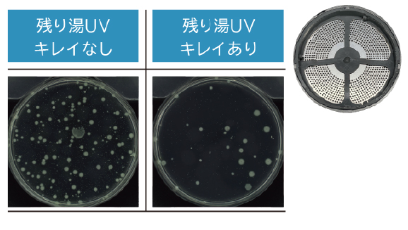 - ※5[試験機関](株)ノーリツ[試験方法]おとな4人が180L、40℃設定のふろに各10分間入浴。「残り湯UV キレイあり」の場合と「残り湯UV キレイなし」の場合の、循環アダプタ裏面を検査キットで拭き取り、残存した菌数を測定。[菌数測定機関](株)総合水研究所[試験番号]N2501177(実使用での実証実験ではありません。使用環境により効果は異なります。)