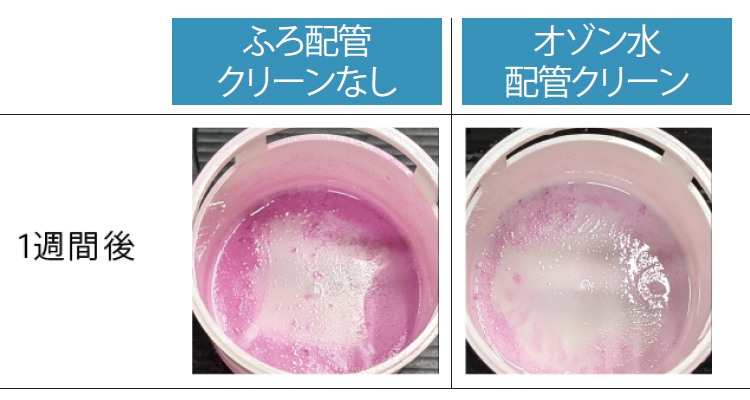 - ※1[試験機関](株)衛生微生物研究センター[試験番号]2022D-BT-80009[試験方法]内壁に試験菌液を付着させたふろ配管に対し「オゾン水配管クリーン」を実施。