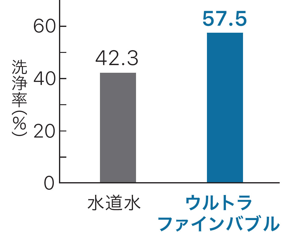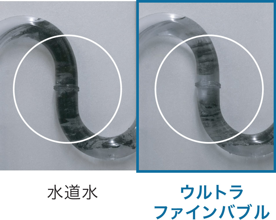 - 排水管洗浄:【実験方法1】排水管に疑似汚れを溜め、流量5L/分で試験水(A、B)を通水し20秒時点の減少率を比較。試験水:A)水道水、B)試験水Aを水温:40℃、水圧:0.2MPaの条件にて生成したウルトラファインバブル水を使用。