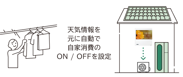 お客さまご自身で、リモコンや「わかすアプリ」から、太陽光発電の自家消費のON/OFFを設定いただけます。