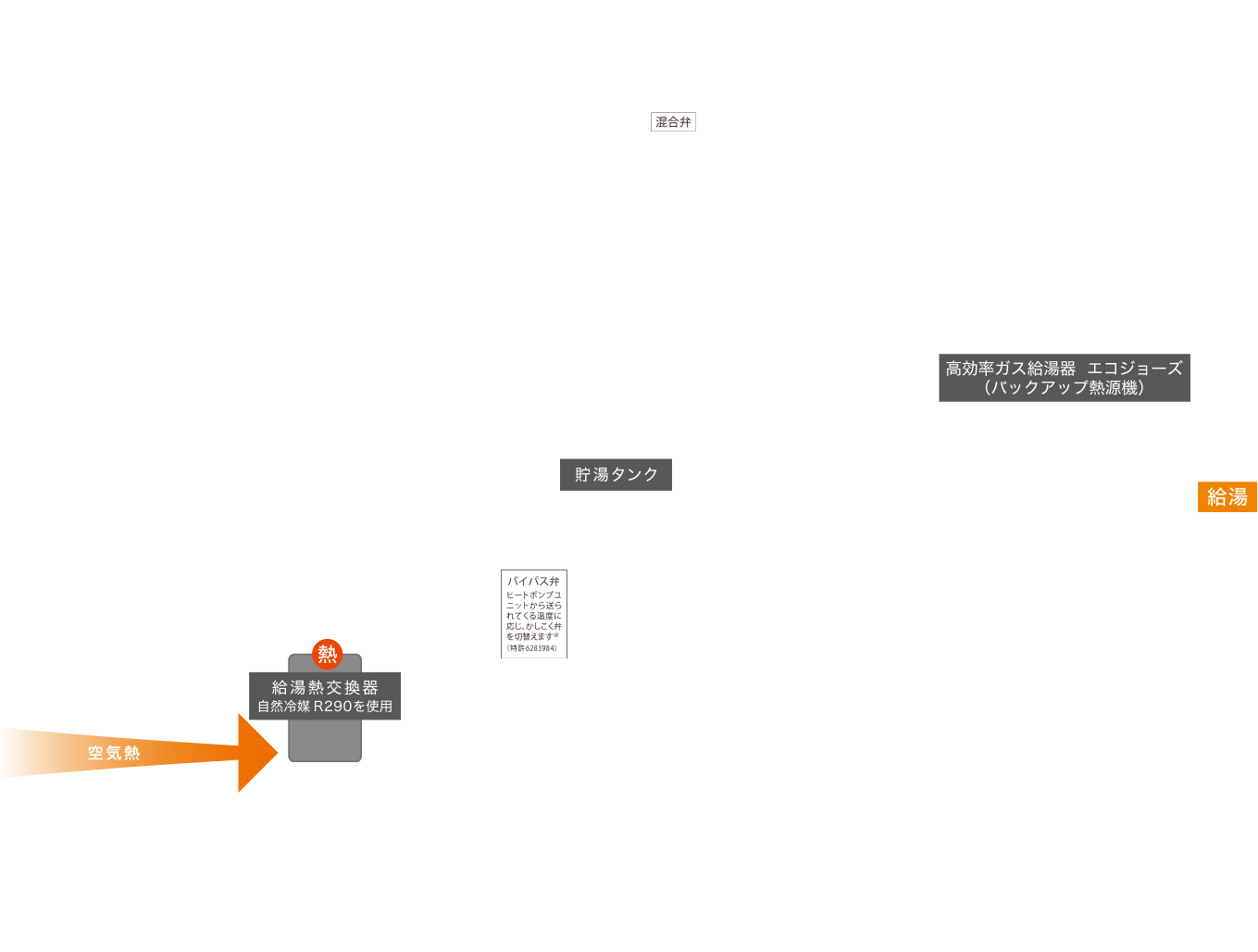 「空気の熱」を利用して、経済性に優れた電気(ヒートポンプ)で効率よくお湯をつくります。