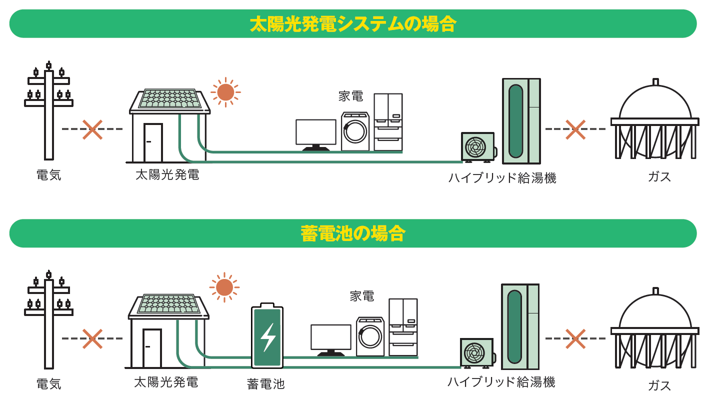 太陽光発電システム、あるいは蓄電池を組み合わせれば、電気とガスの両方が止まっている場合でもヒートポンプを作動させてお湯をわかすことが可能。さらに頼もしい存在に。