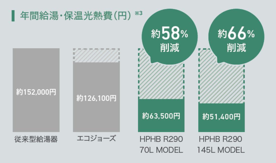 「HPHB R290」はタンクの貯湯量が選べる2モデルを用意。貯湯量145Lモデルは「給湯・ふろ」タイプ(82万8080円)、「給湯・ふろ・温水暖房」タイプ(91万8060 円)。貯湯量70Lモデルは「給湯・ふろ」タイプ(77万8580円)、「給湯・ふろ・温水暖房」タイプ(86万8560円)。