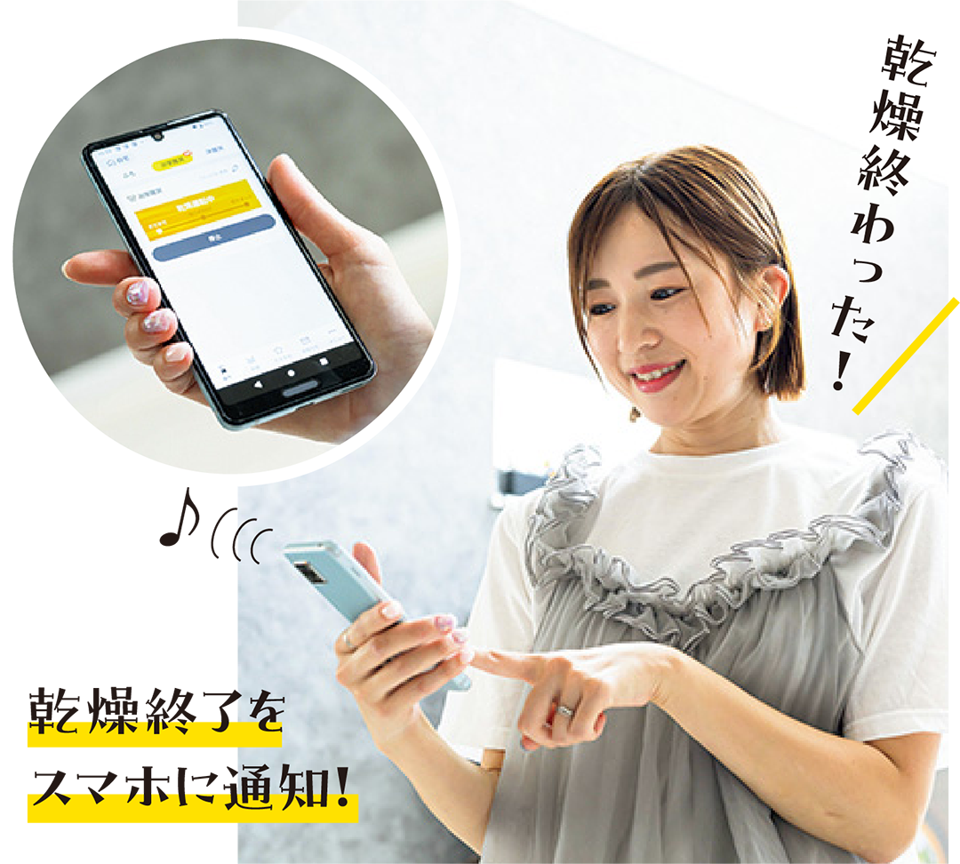 カラッと乾いた浴室でスピーディに衣類を乾燥。4kgの衣類なら1時間程度で乾燥できます。また、乾燥終了をアプリにプッシュ通知でお知らせしてくれる便利機能も◎。